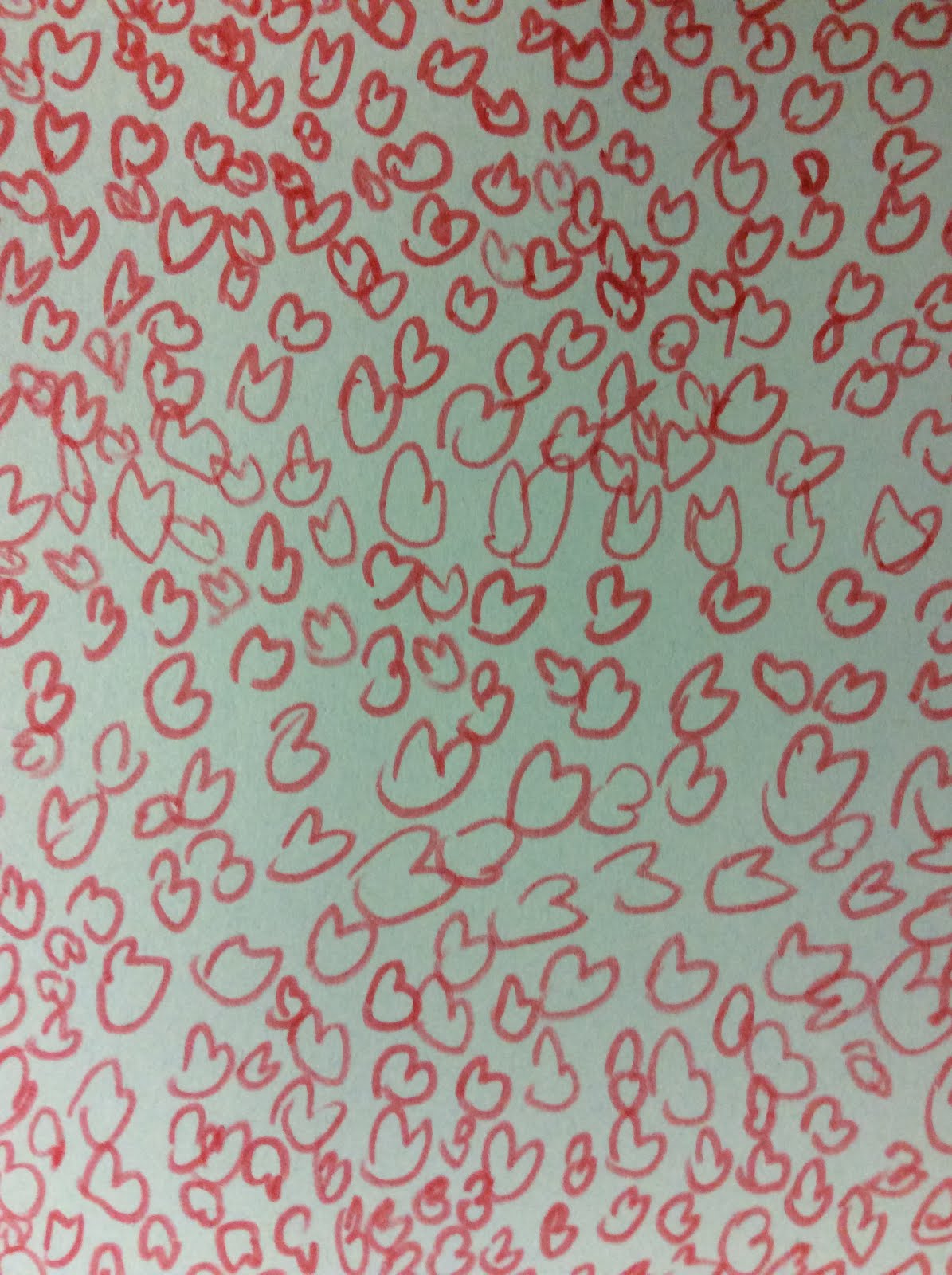This is a tiny sheet of paper that I gave the challenge to my students to fill with as many hearts as they can. I showed them a couple of ways to draw hearts and they took off. I said I would put the highest number on the board when at the end of the class and that was enough motivation for many of the kids in class.
