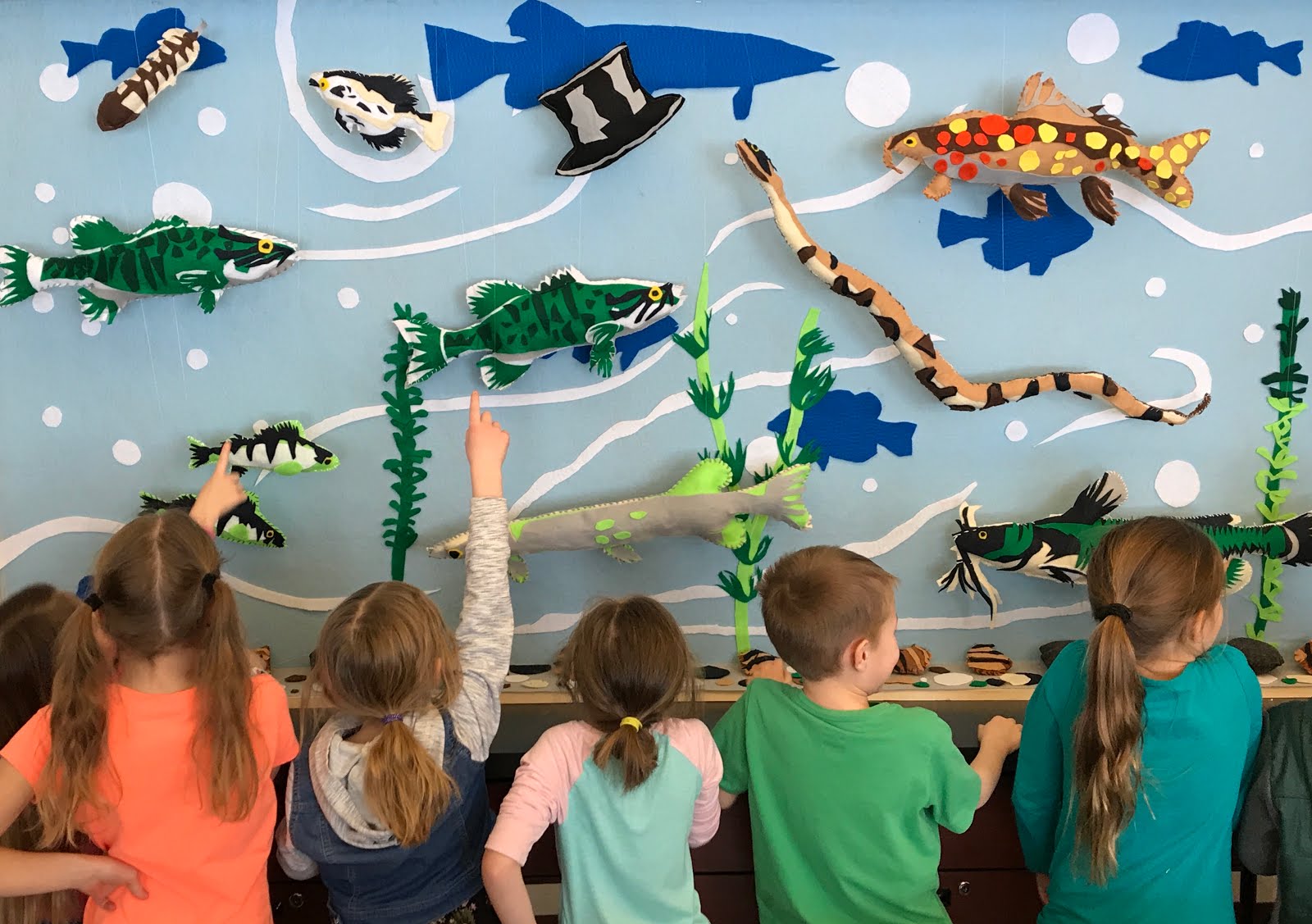 I talked Billy into visiting Minnesota from California in the middle of February (brave dude). This is where I had extra help again. I asked my friends Denver and Kristen who are crafters and owners of a company called Denver Chalks and fans of the show to be the airport shuttle. Billy and I met up Monday night, Presedence Day, to go into the school and wrap our head around the execution of the project. We were ready... or so we thought. Any of you who teach Elementary Art and rotate classes through on a regular basis you know the first class teaches you how to teach. You get better as the week goes on. So we started by cutting paper patterns for the felt fish. It was awkward and disjointed on day one, but we learned a lot.